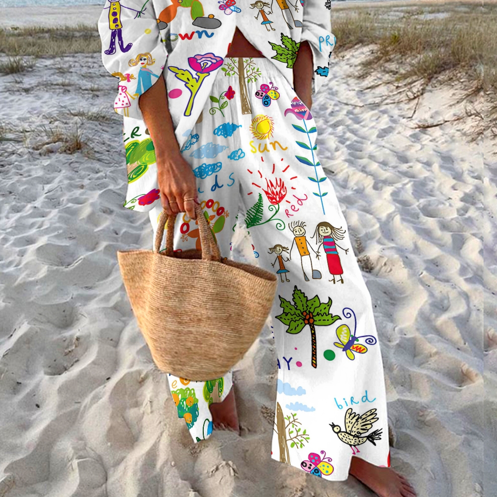 Girls' Illustration Print Shirt and Pants Two-Piece Set